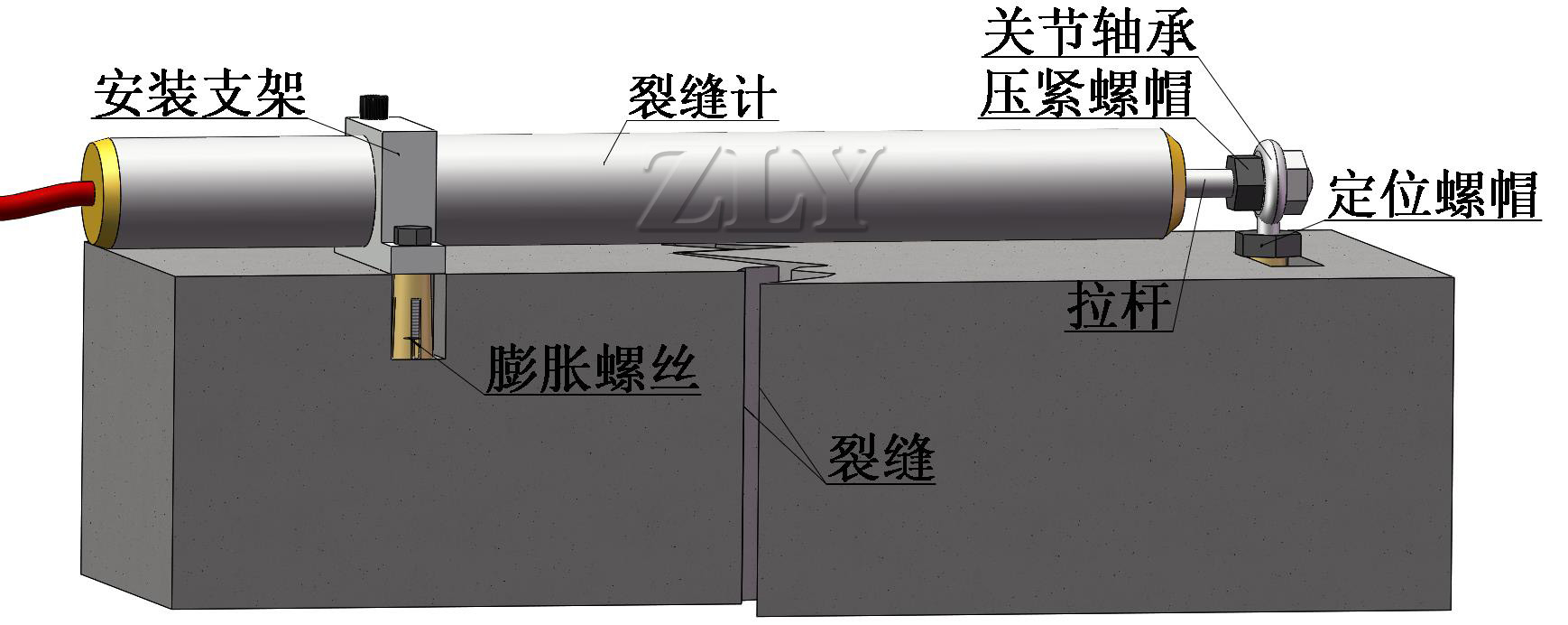 ZLY-V7000D型振弦式位错计适用于监测二块混凝土之间的结构缝、混凝土与岩石接触縫等二个连续固体介质间的位移。位错计实际是一个安装在二个固体介质结构縫内,两个端点分别固定在二边介质上的测縫计,当位错方向无法预计时,可在位移杆端头加一节柔性杆。